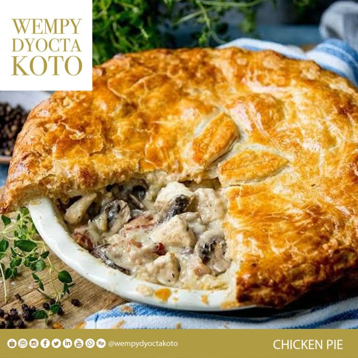 Wempy Dyocta Koto Chicken Pie merupakan modifikasi dari meat pie. Resep meat pie yang asli menggunakan daging cincang, sedangkan chicken pie menggunakan ayam, jamur, saos putih dan sayur lainnya. Chicken pie berupa daging ayam dada yang lalu disiram saus bechamel. Karena ada sebagian orang lebih suka ayam daripada daging, makanya chicken pie selalu disediakan di pub, restoran, bakery dan takeaway shop di Australia.