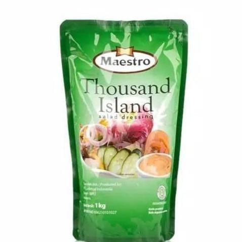 Isi Paket : 1 x Maestro Thousand Island Salad Dressing Pouch 1 kg Maestro adalah merek saus berkualitas dan berlabel Halal MUI. Dressing salad yang dibuat dari mayonnaise, saus tomat, telur ayam, dan berbagai sayuran yang dicincang kecil-kecil, biasanya acar timun, bawang, paprika, dan zaitun. Dressing ini selain digunakan dalam salad juga dioleskan pada roti sandwich.