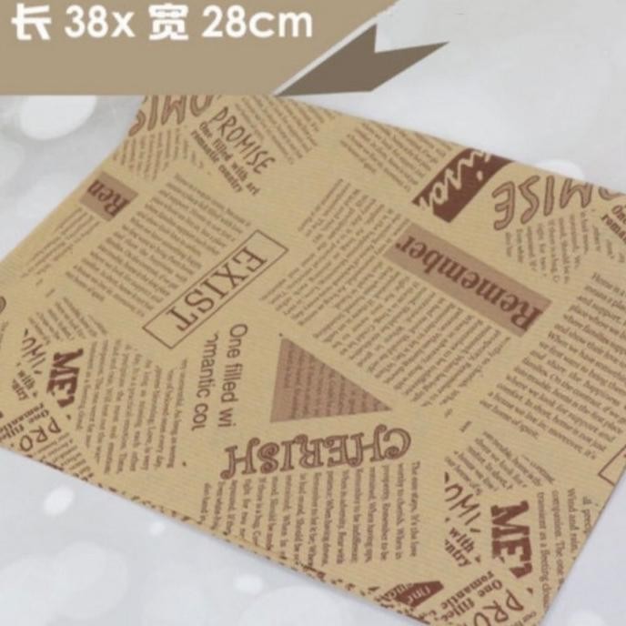 1 Pak isi 10 Pcs Wrapping paper motif koran Good Quality Material Bahan Tebal kualitas : FOOD GRADE jenis : kertas baking dengan laminasi 1 sisi. kegunaan : - untuk alas gorengan - untuk penyerap minyak - kertas pembungkus burger - kertas pembungkus nasi - kertas pembungkus kue - kertas pembungkus sandwich - properti foto dll
