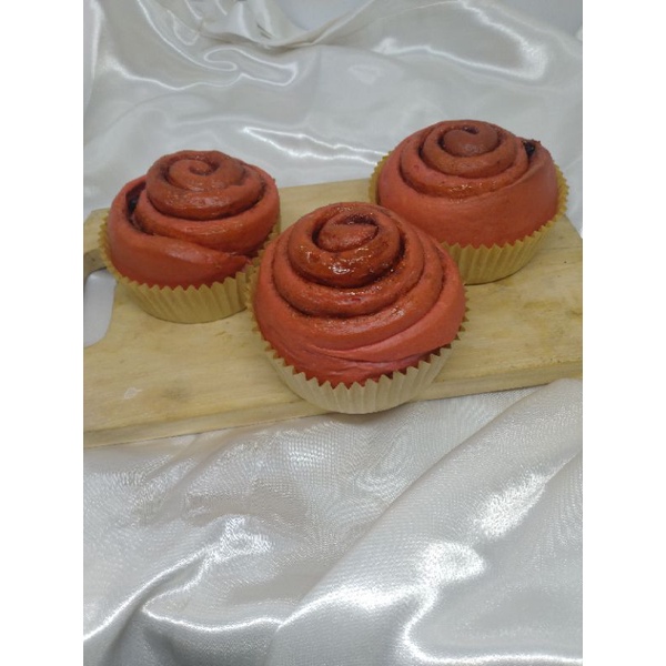 Cinnamon Roll varian Red Velvet dengan roti yang lembut, wangi dari bubuk kayu manis, gula palem dan perisa Red Velvet. 1 pack isi 2