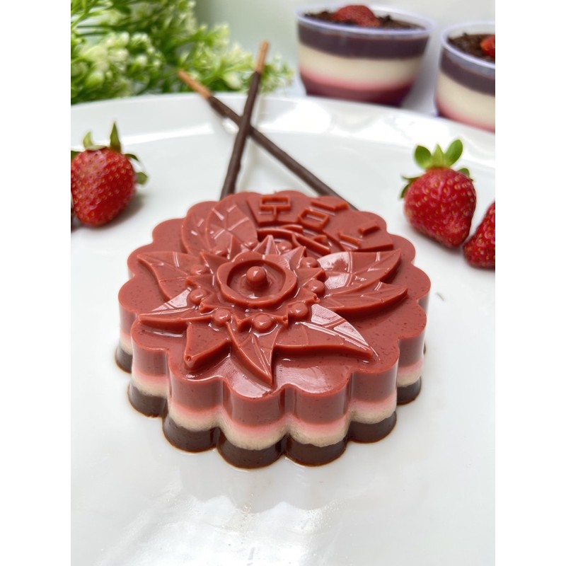 Pudding 3 lapis dengan rasa dan varian yang berbeda beda, dengan rasa white chocolate & cheese, dark chocolate with milk, dan red velvet yang membuat spesial dengan taburan coklat serut dan potongan stroberi.