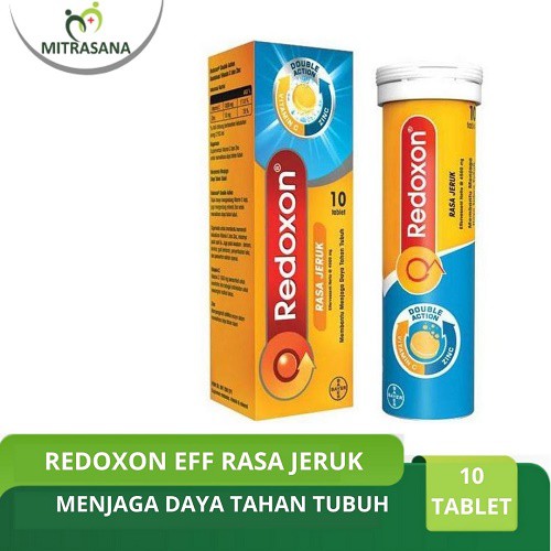 Redoxon Vitamin C + Zinc Rasa Jeruk 10 TabletRedoxon Triple ActionRedoxon terus berinovasi memberikan perlindungan optimal. Kini dilengkapi dengan vitamin D yang bekerja sama dengan vitamin C dan Zinc membantu menjaga daya tahan tubuh pada saat perjalanan, kondisi perubahan cuaca, dan paparan polusiKegunaanSuplementasi Vitamin C dan Zinc untuk memelihara daya tahan tubuhVitamin CVitamin C 1000 mg bermanfaat untuk membantu menjaga daya tahan tubuh dan kesehatan serta berperan sebagai antioksidan untuk menangkal radikal bebas.Vitamin DVitamin D bermanfaat untuk membantu kinerja kelompok sel darah putih dalam menjaga daya tahan tubuh.Zinc•Membantu kinerja Vitamin C sehingga menjadi lebih efektif dalam menjaga daya tahan tubuh. •Zinc tidak dapat diproduksi tubuh. Jika asupan dari makanan tidak mencukupi kebutuhan harian, bila perlu, dapat diberikan suplementasi. Anjuran PemakaianSatu tablet effervescent per hari, larutkan dalam segelas airPetunjuk PenggunaanLarutkan dalam segelas air dan tunggu sampai benar-benar larut.