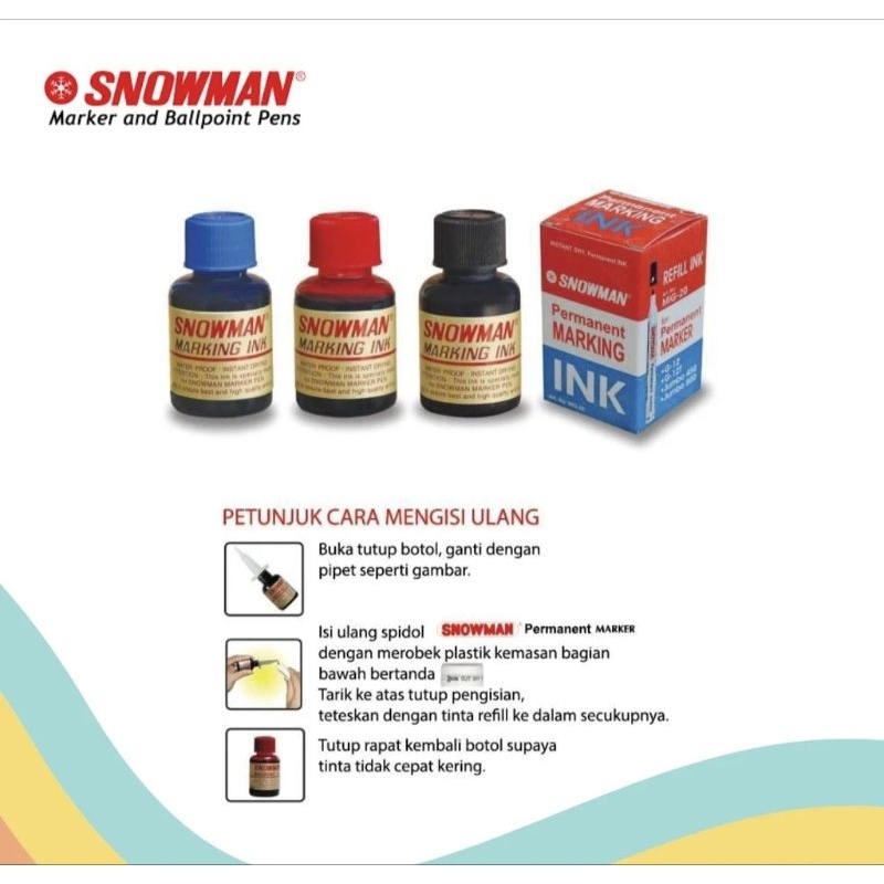 Tinta Snowman Permanent ini untuk mengisi ulang / refill spidol permanent G12, Jumbo 450N Jumbo 500, dilengkapi dengan pipet kecil untuk mempermudah pengisian.