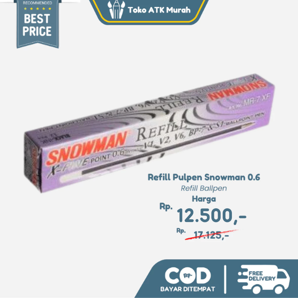 Refill Pulpen Snowman 0.7 merupakan refill untuk pulpen snowman yang berukuran 0.6mm, seperti V1, V2, V6, BP-7. Dengan kualitas terbaik serta anti kering membuat para user sangat senang menggunakan pulpen ini.