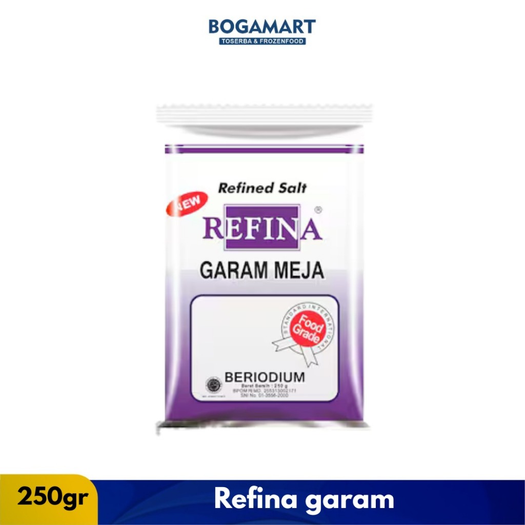 Refina Garam Meja 250gr adalah garam halus beryodium yang telah melalui proses pemurnian sehingga aman dan higienis untuk konsumsi sehari-hari. Produk ini dikemas dalam satu bal berisi 40 pcs, sangat cocok untuk keperluan rumah tangga, warung makan, usaha kuliner, maupun dijual kembali.