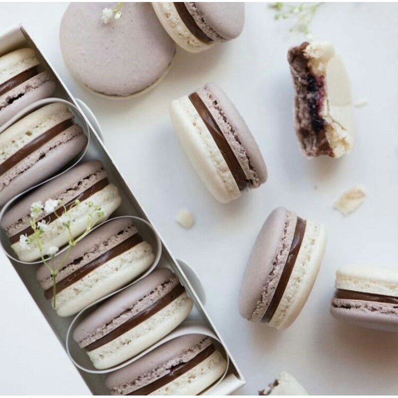 6 regular macaron ukuran 3,5cm-4cm rasa mix (TIDAK BISA PILIH RASA), ada rasa: chocolate additct, real oreo, strawberry, lemon fresh, classic french vanilla, matcha greentea, chocolate mint, grape, etc.