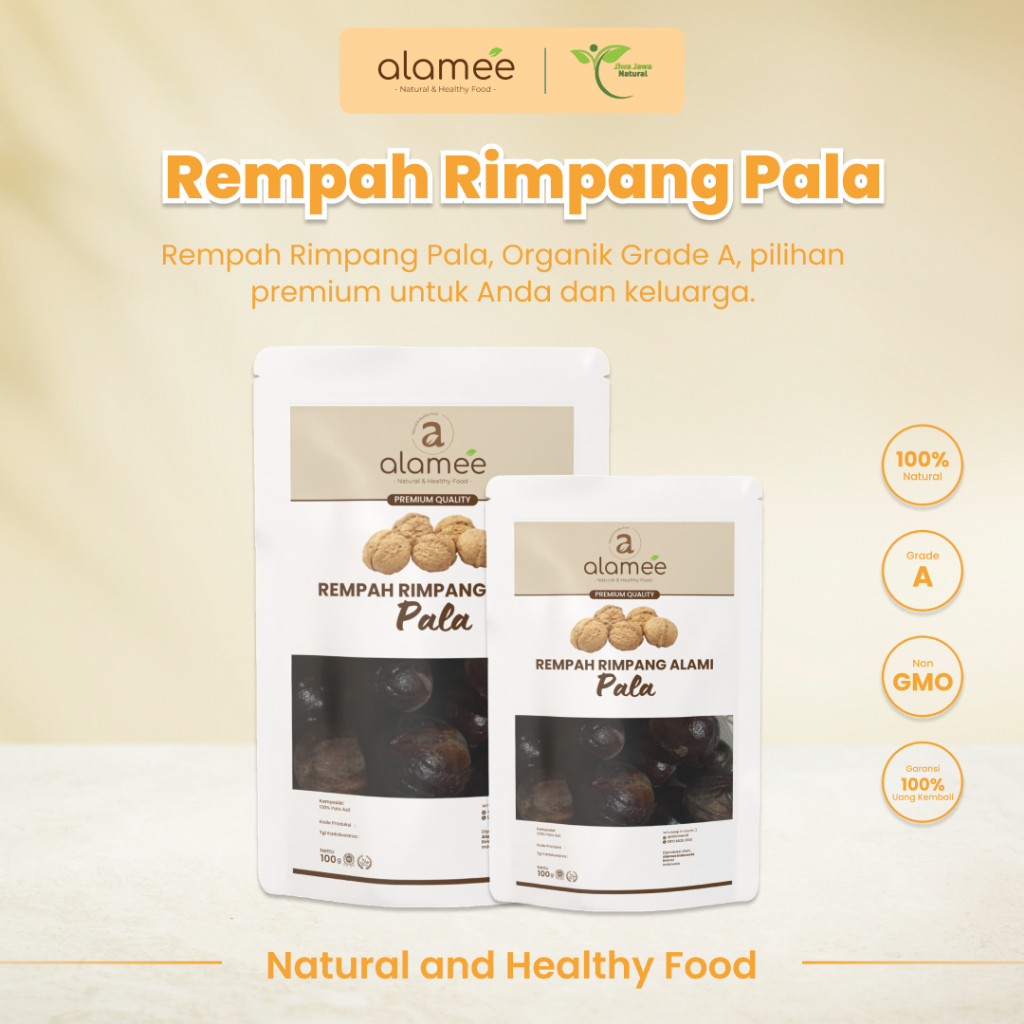 Pala Utuh Alamee adalah Pala asli tanpa campuran dan pengawet sehingga aman untuk dikonsumsi dan dengan citra rasa yang berkualitas tinggi.