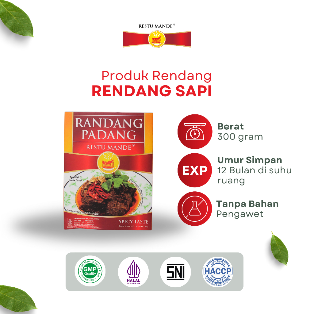 Rendang Sapi Restu Mande berisi kurang lebih 5-6 potong daging tanpa lemak dengan kemasan plastic vacuum tahan panas dan dimasukkan ke dalam aluminium foil serta dipacking dengan dus premium, menghasilkan produk yang tahan lama, tanpa mengurangi kelezatannya