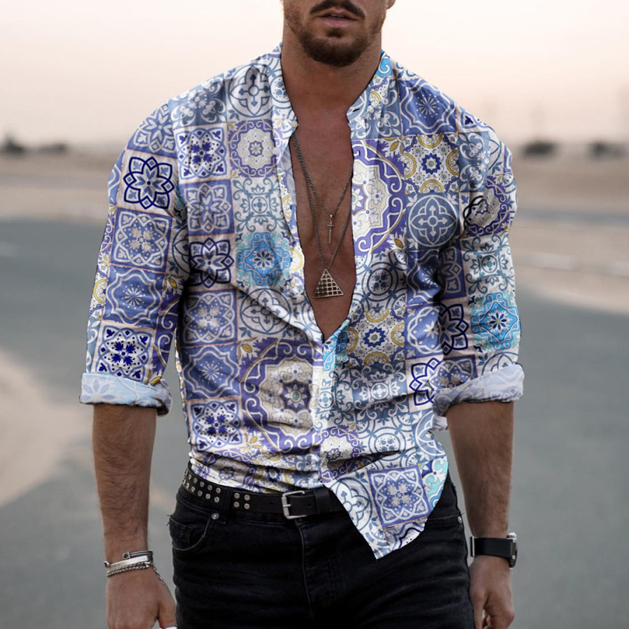 button-downs,retro mens holiday ethnic style stitching printed shirt