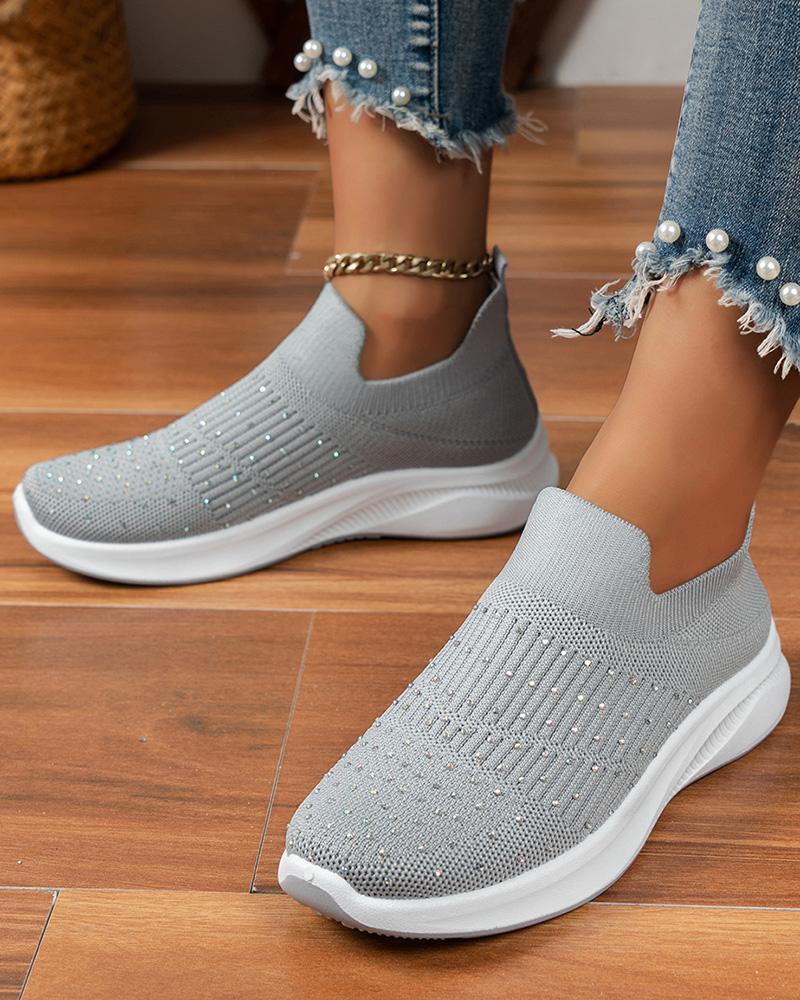 Rhinestone Decor Platform Knit Running Sneakers, Gray