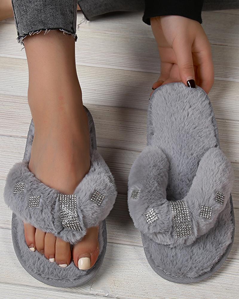 Rhinestone Decor Top Post Fuzzy Flip Flops, Gray