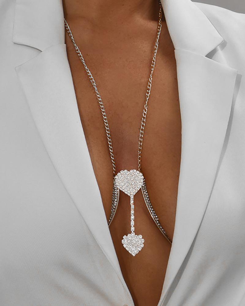 Rhinestone Double Heart Shaped Body Chain, Silver