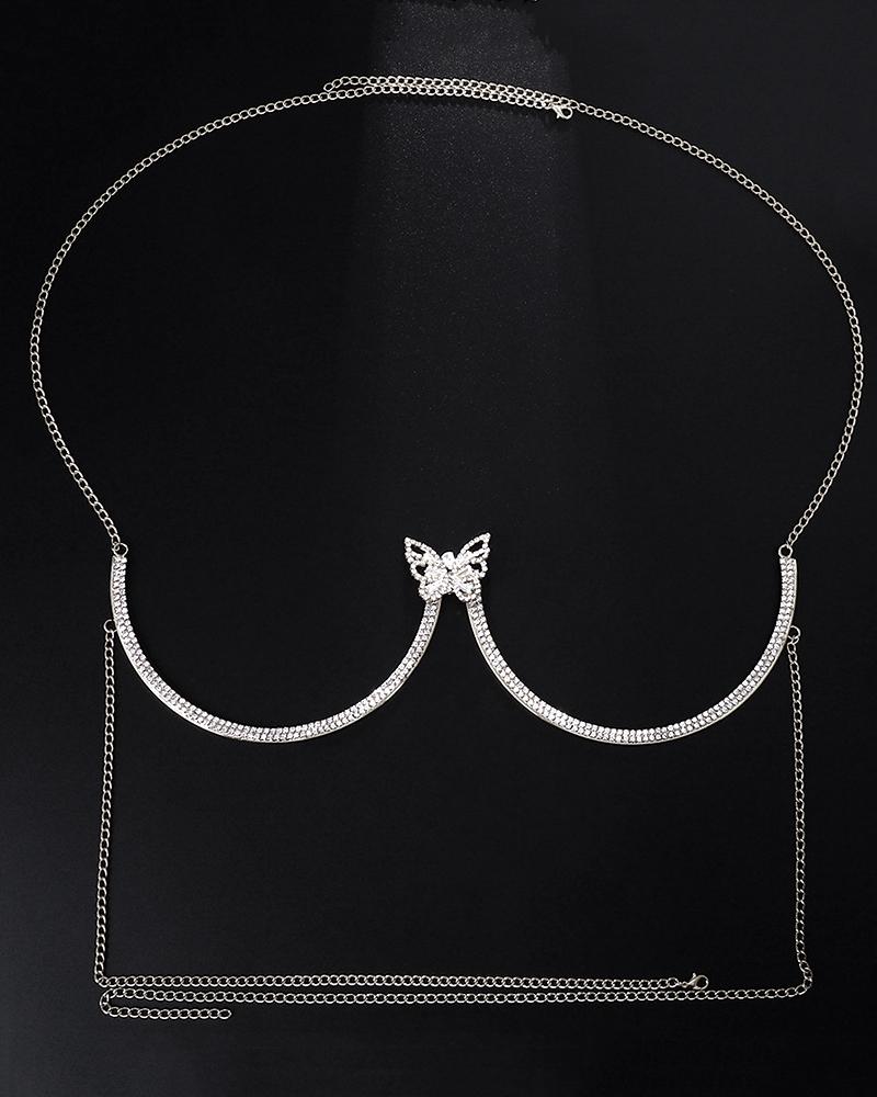 Rhinestone Halter Butterfly Pattern Bra Body Chain, Silver