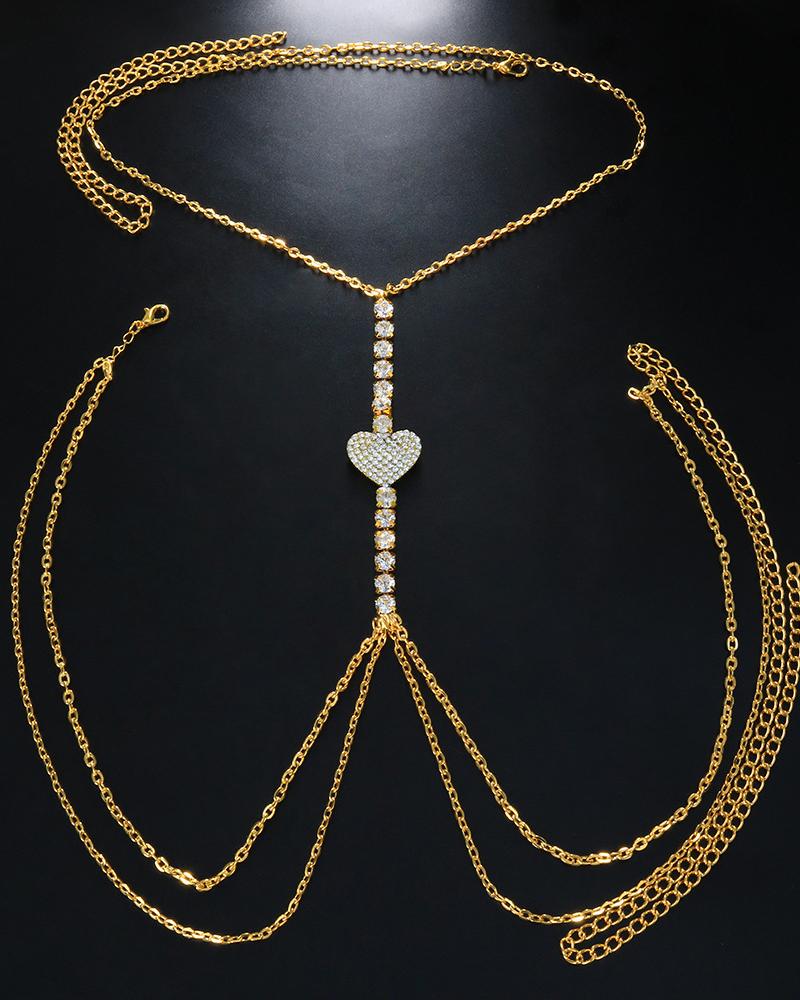 Rhinestone Heart Pattern Layered Crossover Body Chain, Gold