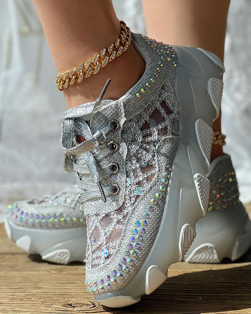 Rhinestone Lace Patch Contrast Sequin Sneakers, Silver