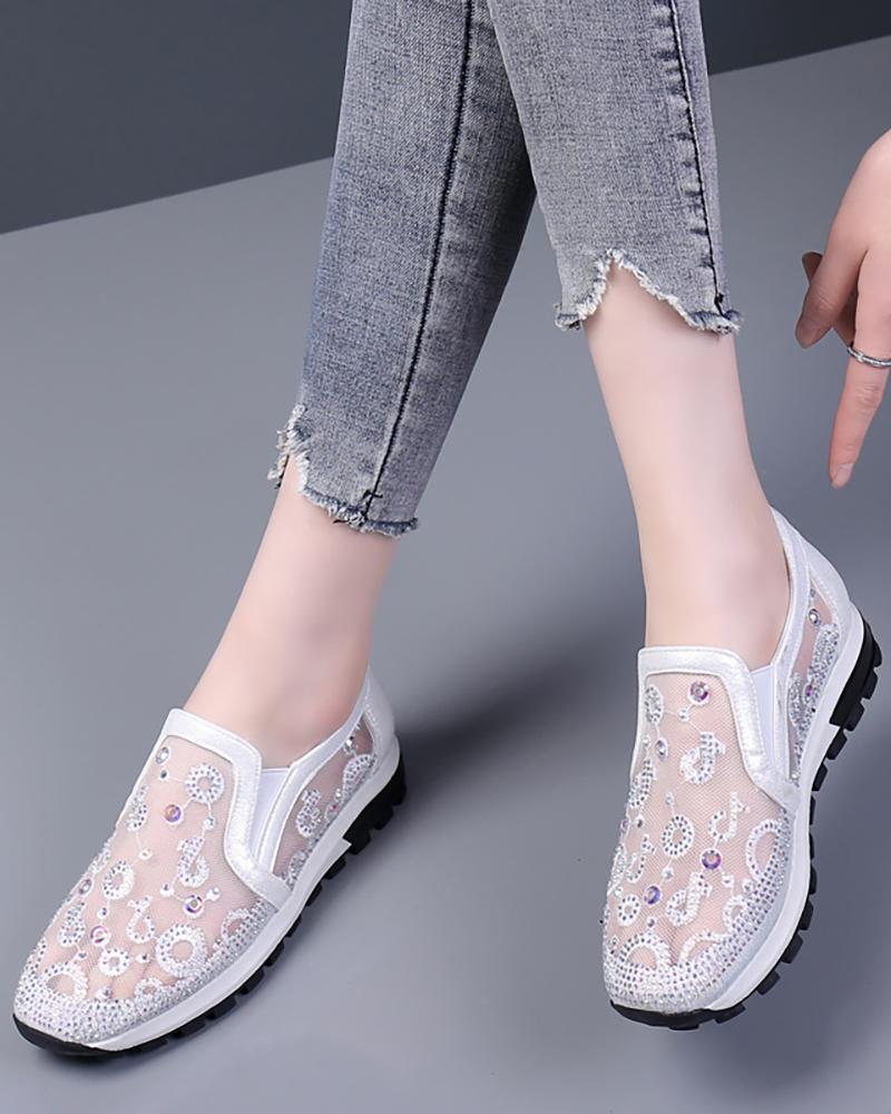 Rhinestone Music Notes Pattern Sheer Mesh Sneakers, White