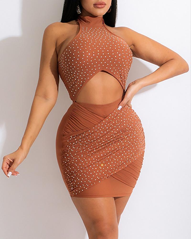 Rhinestone Sleeveless Cutout Front Ruched Bodycon Dress, Orange