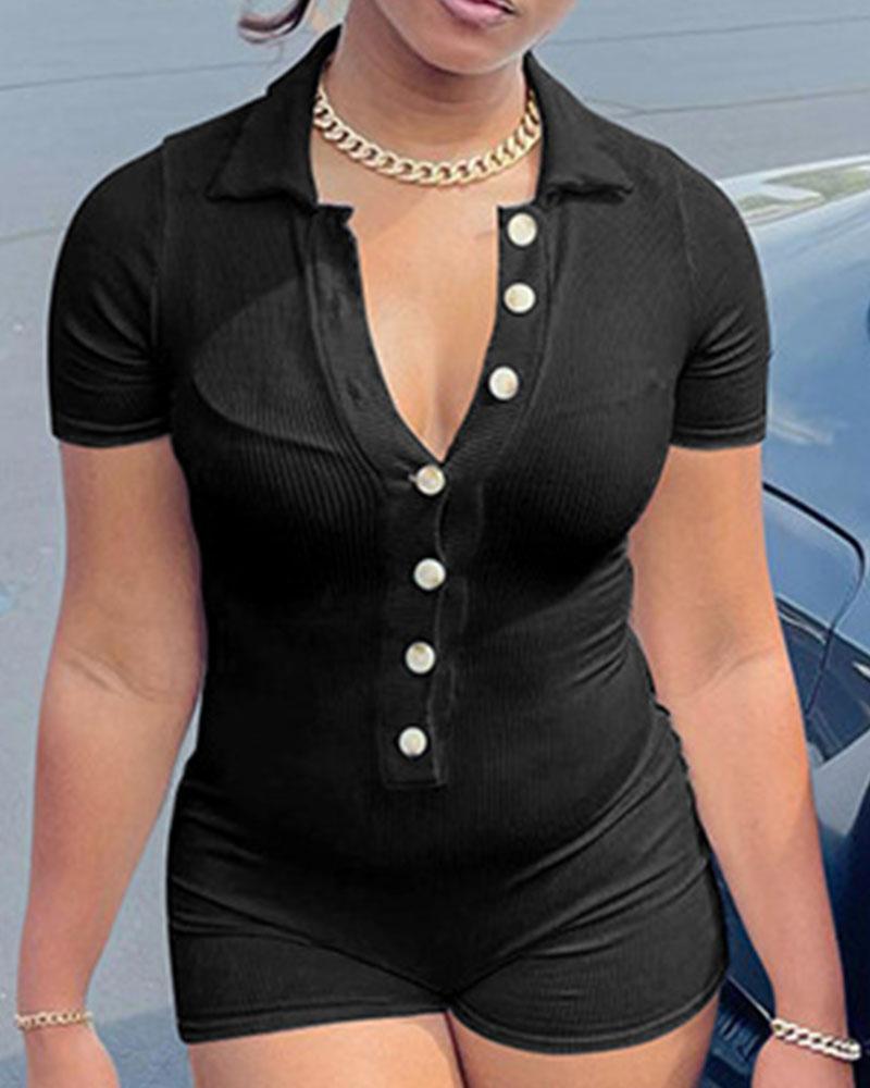 Ribbed Button Front Skinny Romper, Black