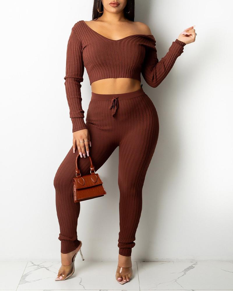 Ribbed Long Sleeve Crop Top & Drawstring Pants Set, Coffee