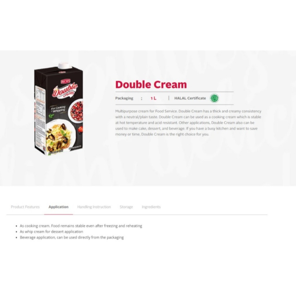 Krim serbaguna untuk Layanan Makanan. Double Cream memiliki konsistensi yang kental dan lembut dengan rasa yang netral/ tawar. Double Cream dapat digunakan sebagai krim masak yang stabil pada suhu panas dan tahan asam. Aplikasi lainnya, Double Cream juga dapat digunakan untuk membuat kue, makanan penutup, dan minuman. Jika Anda memiliki dapur yang sibuk dan ingin menghemat uang atau waktu, Double Cream adalah pilihan yang tepat untuk Anda.