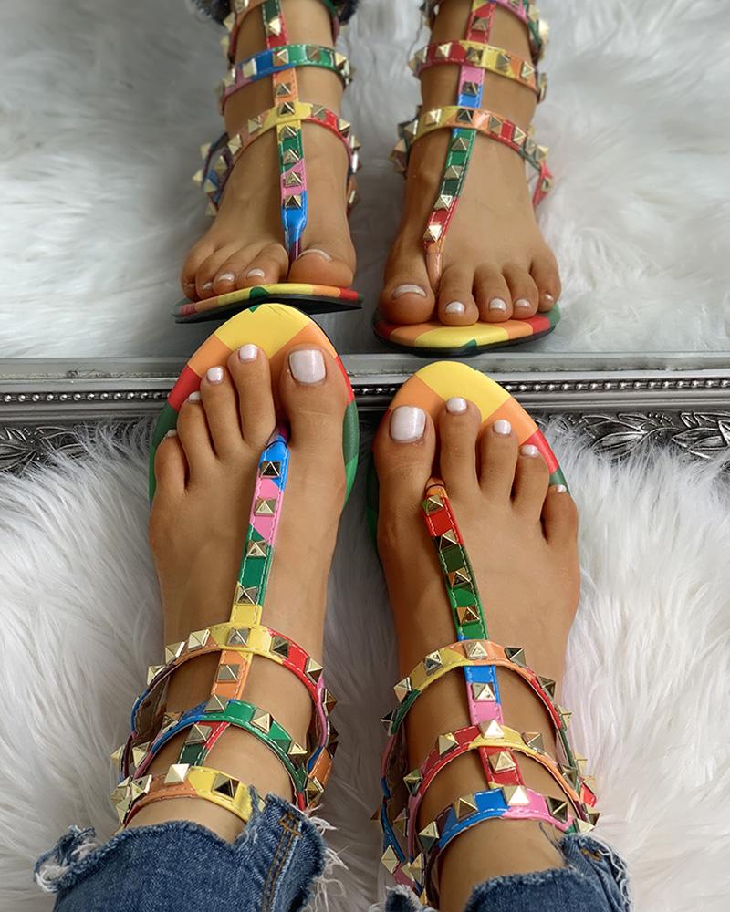 Rivets Multi Strap Toe Post Flat Sandals, Multicolor