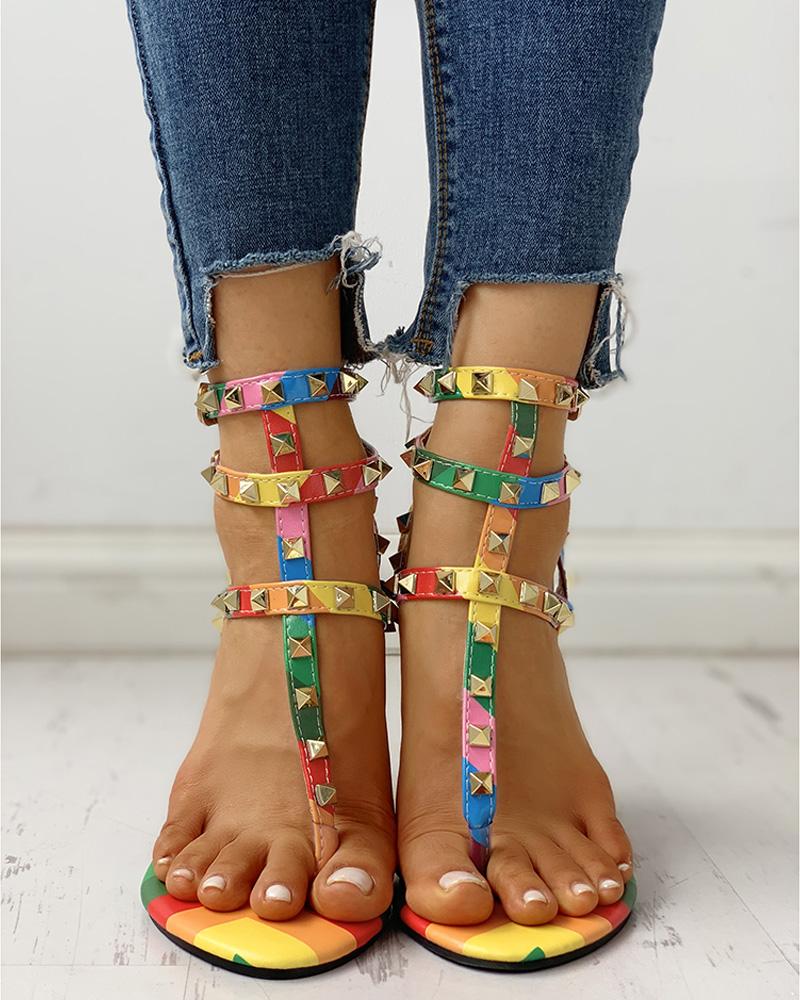 Rivets Multi Strap Toe Post Flat Sandals, Multicolor