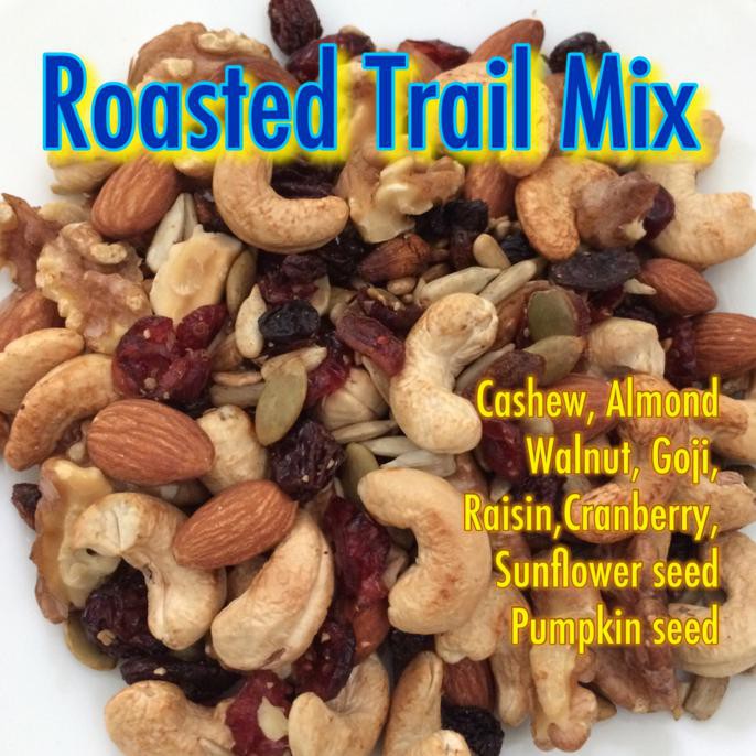 Roasted Trail mix dipanggang tanpa menggunakan minyak sama sekali. Snack sehat ideal bernutrisi tinggi memberikan energi instant. Cocok dimakan setelah berolahraga atau penganjal perut yang rendah lemak di saat lapar.