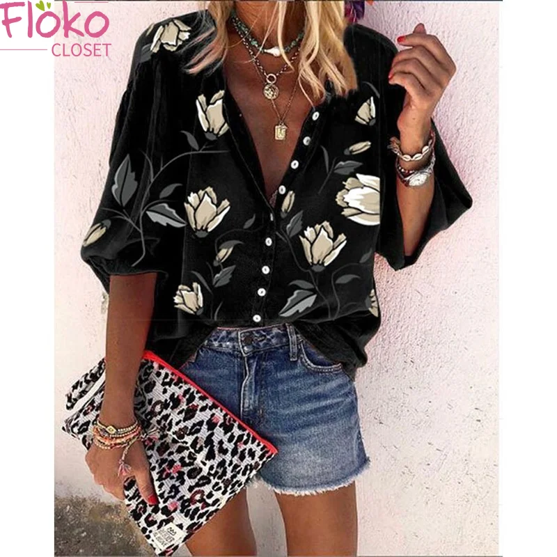 women's fashion summer new regular short sleeve single row multi button commuter print loose versatile shirt top
