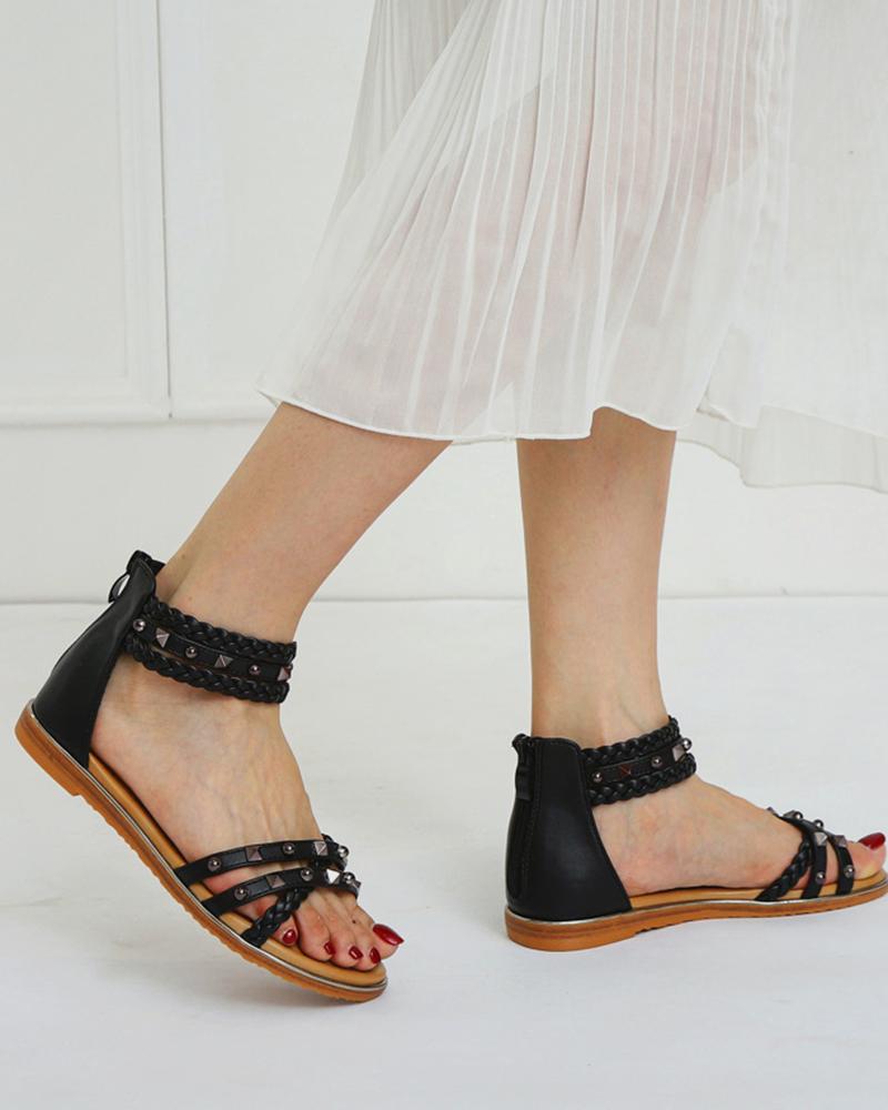 Rome Style Round-toe Solid Color Splicing Studded Weave Flat Sandals, Black