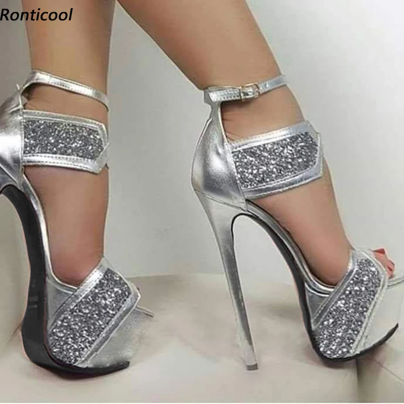 Ronticool женские летние сандалии ручной работы блестящие туфли на шпильках с открытым носком Великолепные золотые и серебряные туфли Женская Американская модель 5-20