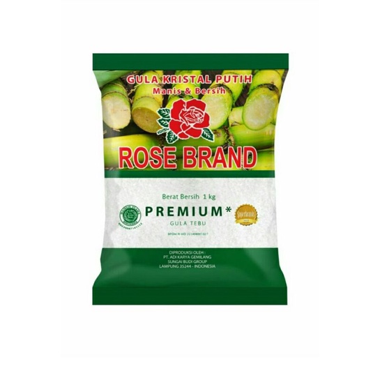 Gula Rose Brand dengan berat 1000 gram / 1 kg perkemasan.
