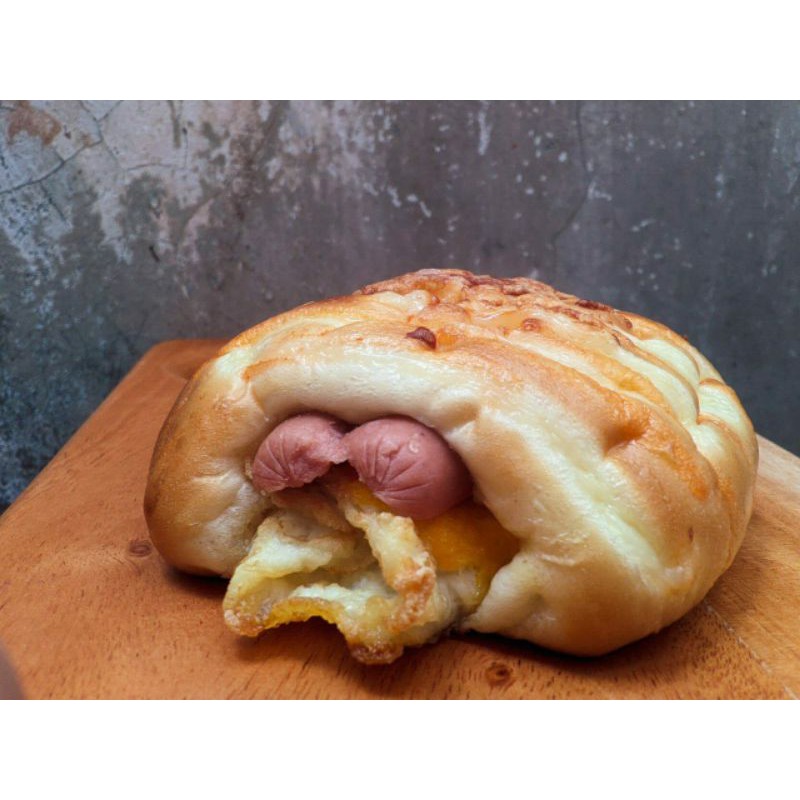 Roti dengan taburan keju + saus dan filling isi sosis + telor