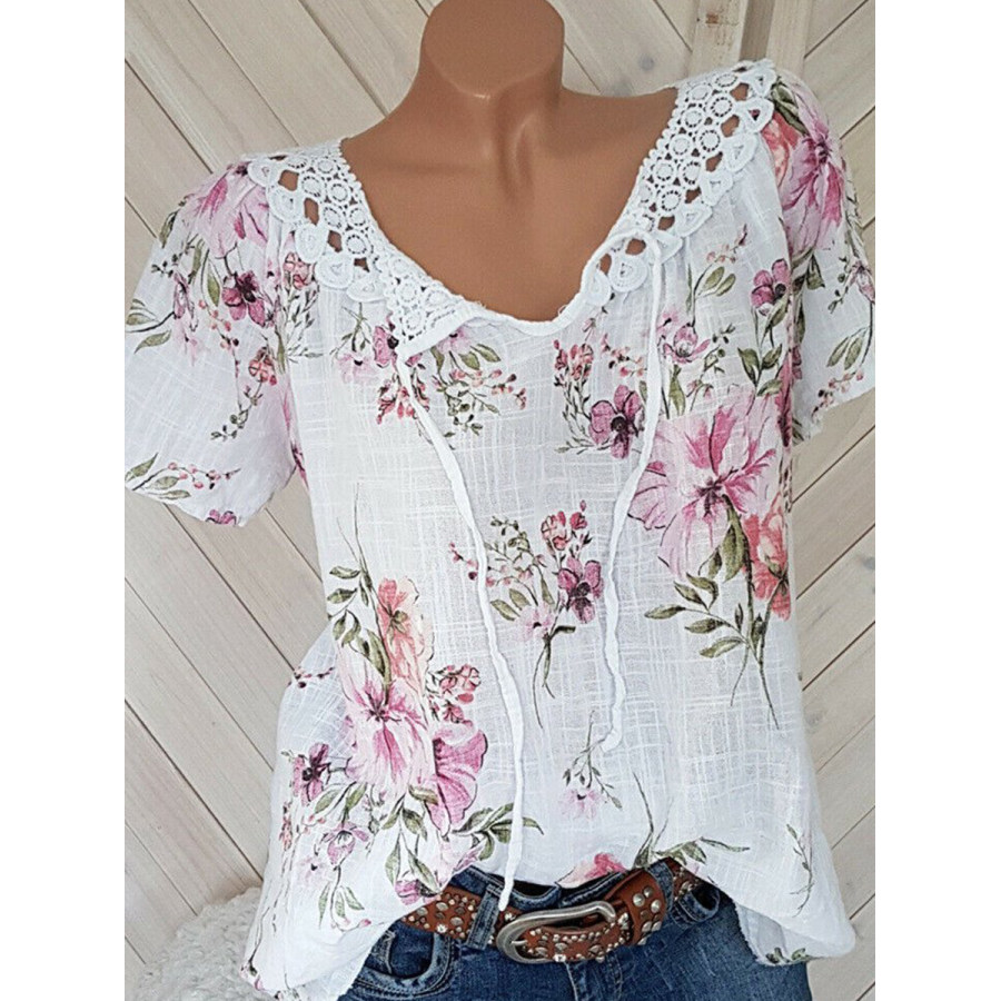 Round Neck Patchwork Lace Printed Blouses