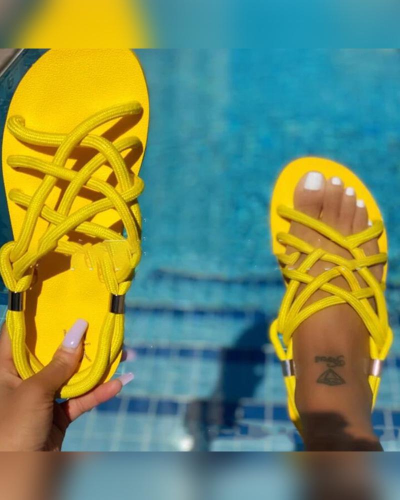 Round-toe Solid Color Cross Strap Flat Sandals, Yellow