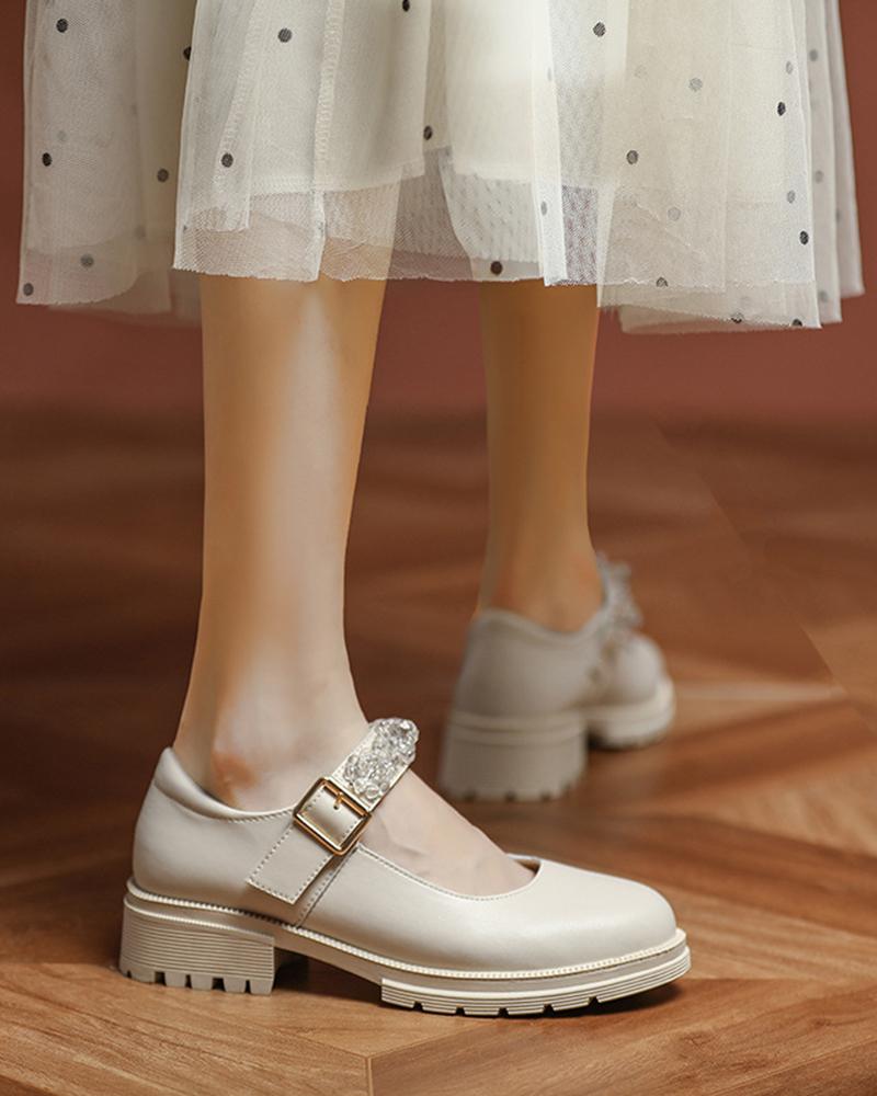 Round-toe Solid Color Splicing Rhinestone Strap Jenny Shoes, Beige