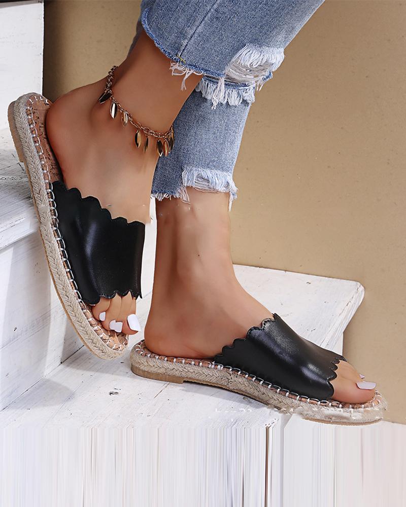Round-toe Solid Color Strap Flat Slippers, Black