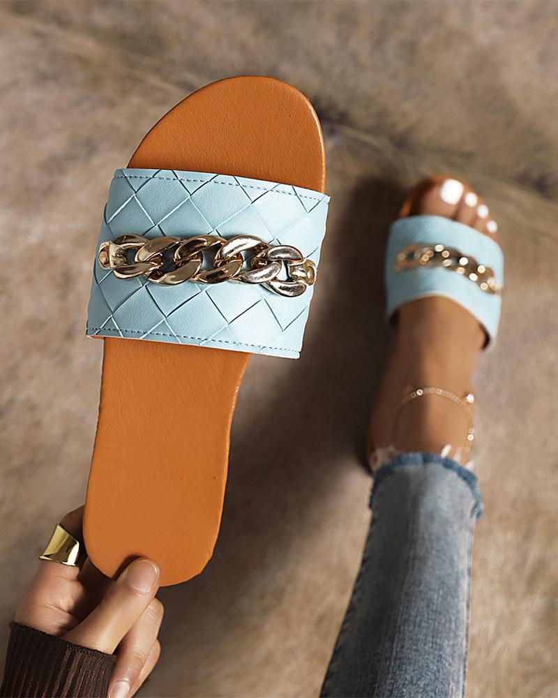 Round-toe Solid Color Weave Splicing Chain Flat Slippers, Blue