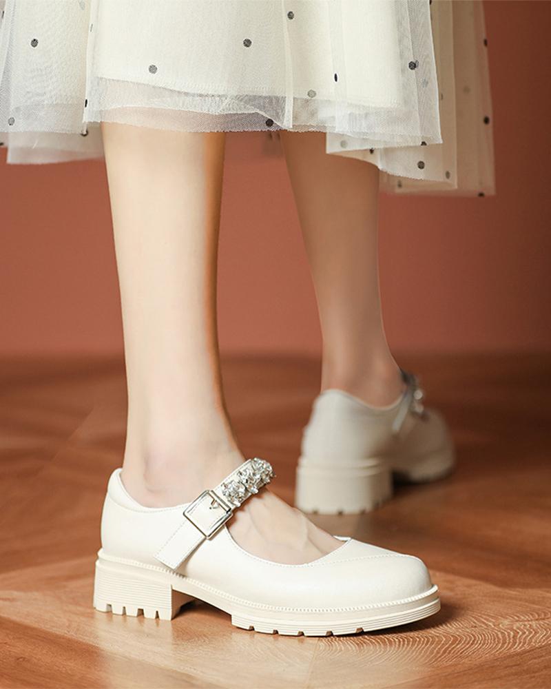Round-toe Splicing Rhinestone Jenny Shoes, Beige