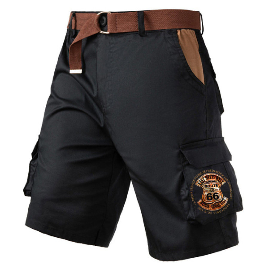 Route 66 Print Men's Retro Contrast Pocket Outdoor Multi-pocket Cargo Shorts