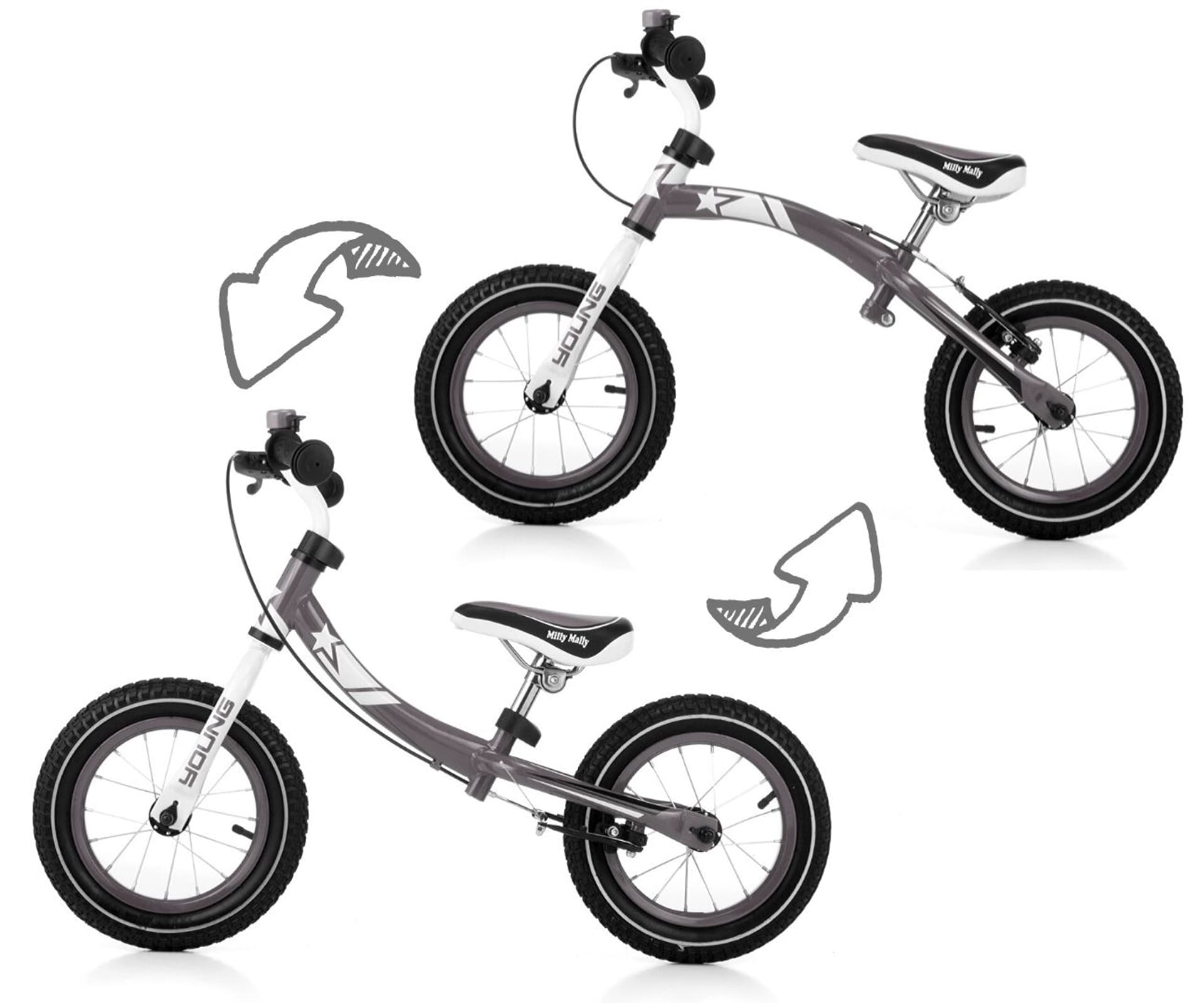 Rowerek biegowy YOUNGMoże urządzimy małe czary mary! Mogę być dla dużych i małych… Rowerek biegowy YOUNG to innowacja wśród rowerków biegowych – połączenie designu z praktycznością. Zastosowana w rowerku obracana rama, sprawia iż rowerek jest idealny dla dzieci w wieku od 3 – 6 lat. Pozwoli to Waszemu dziecku dłużej cieszyć się ulubionym rowerkiem, który będzie „rósł” wraz z nim. W rowerku zastosowany został tylny hamulec ręczny typu V-brake, dzięki czemu w znacznym stopniu zwiększony został poziom bezpieczeństwa. Hamulec pozwala zatrzymać rowerek w dogodnym momencie. Natomiast duże, bieżnikowane, pompowane opony zapewniają stabilność oraz amortyzację na każdej powierzchni, a łożyskowane koła zwiększają komfort podczas jazdy Miękkie antypoślizgowe rękojeści z osłonkami zapewnią ochronę dłoni dziecka, a regulowana wysokość siodełka i kierownicy pozwoli dostosować rowerek do wzrostu dziecka. Posiada również ogranicznik skrętu – zabezpieczenie przed skręceniem kierownicy w sposób uniemożliwiający jazdę. Nieocenioną atrakcją jest zamontowany dzwonek, który pokocha każde dziecko. Pozwala on małemu cykliście ostrzegać innych. Rowerek Young towarzysząc Waszemu dziecku podczas spacerów i przejażdżek, wspomaga trening utrzymania równowagi, koordynację ruchową oraz kierowanie i hamowanie. Rowerek pozwoli również Waszemu dziecku nauczyć się właściwie oszacować prędkość i odległość. Dzięki temu dziecko prawidłowo i szybko się rozwija. Ten fantastyczny rowerek znakomicie przygotuje Wasze dziecko do samodzielnej jazdy na rowerze bez konieczności instalowania bocznych kółek.CHARAKTERYSTYKA PRODUKTU: Obracana rama. Pompowane 12" koła. Regulacja wysokości siodełka. Regulacja wysokości kierownicy. Hamulec ręczny typu V-brake Otwór do przymocowania podnóżka. Łożyskowane koła. Antypoślizgowe, gumowe rączki. Wyprofilowane miękkie siodełko. Dzwonek. Przedział wiekowy 3- 5+.DANE TECHNICZNE: Długość całkowita rowerka: 89 cm Odległość od kierownicy do sztycy siodełka: 28 cm Długość ramy: 56 cm Długość siodła: 20 cm Szerokość kierownicy: 44 cm Wysokość kierownicy: 57 cm Wysokość siodełka przy montażu ramy w niższej pozycji: 38-43 cm Wysokość siodełka przy montażu ramy w wyższej pozycji: 43-46 cm Szerokość bieżnika: 5,5 cm Maksymalne obciążenie do 20 kg Waga: 4,4 kgWYMIARY OPAKOWANIA: Wysokość: 71 cm Szerokość: 16,5 cm Długość: 32 cm Waga z opakowaniem 5,4 kg