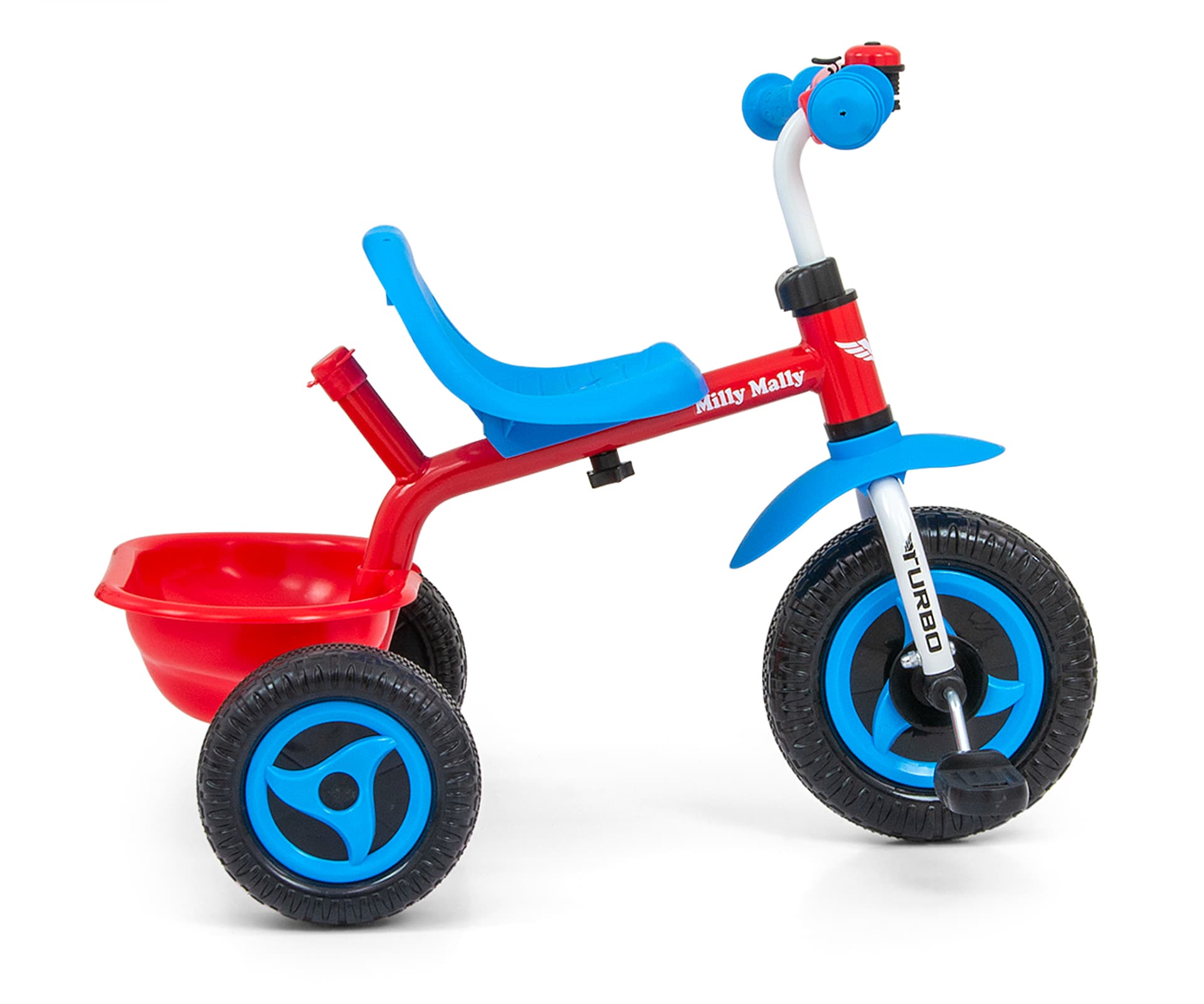 Rowerek Trójkołowy TURBO Rowerek trójkołowy TURBO został stworzony z myślą o komforcie i bezpieczeństwie maluszków, oraz wygodzie rodziców. Idealne rozwiązanie dla aktywnych Smyków. TURBO to stabilny i bezpieczny rowerek dla Twojego dziecka, posiada ponadczasową konstrukcję, wygodne wyprofilowane siedzisko, oraz trzypunktowe pasy bezpieczeństwa. Dodatkowo rączka dla rodzica pozwala na dalszą jazdę gdy nasz młody cyklista jest już zmęczony. Dzięki funkcji „wolnego koła” dziecko może oprzeć nóżki na pedałach, podczas gdy rodzic prowadzi rowerek przy użyciu rączki. Siedzisko w rowerku posiada regulację – 4 odległości od kierownicy, pozwala to dopasować rowerek do wzrostu dziecka. Połączenie metalowej konstrukcji oraz elementów wykonanych z najwyższej jakości materiałów, daje gwarancję wytrzymałości, która sprawdzi się w każdych warunkach. Natomiast szerokie i wytrzymałe plastikowe koła zapewniają trwałość i długie użytkowanie. Nasz TURBO posiada odczepianą rączkę dla rodzica oraz koszyk na zabawki. Rowerek należy do rodziny produktów GROW UP – rośnie razem z dzieckiem. Dziecko na naszym rowerku ćwiczy dużą motorykę, siłę i mięśnie nóg, utrzymywanie równowagi oraz doskonali koordynację ruchową. Dzięki czemu prawidłowo i zdrowo się rozwija.Najważniejszą zaletą rowerka trójkołowego TURBO jest frajdą jaką dostarcza dzieciom, rodzicom zapewnia kontrolę podczas jazdy i pewność, że dziecko jest bezpieczne.CHARAKTERYSTYKA PRODUKTU: Stalowa rama. Pedały w przednim kole. Funkcja wolnego koła. 3-punktowe pasy bezpieczeństwa. Błotnik nad przednim kołem. Regulacja długości rączki dla rodzica. Możliwość demontażu rączki dla rodzica. Regulacja siedziska. Dzwonek. Koszyk na zabawki. Dostępna kolorystyka: pink, red, green, blue, orange-turquise, cool green, candy, blue-green. Przedział wiekowy 18-36 M.DANE TECHNICZNE: Wysokość rączki dla rodzica: 89 cm Wysokość siedziska od ziemi: 31 cm Wysokość kierownicy: 53 cm Szerokość kierownicy: 40 cm Siedzisko: 15 cm dł., 22 cm szer. Wysokość oparcia: 14 cm Szerokość rowerka: 46,5 cm Długość rowerka: 68 cm Maksymalne obciążenie do 20 kg Waga: 3,5 kgWYMIARY OPAKOWANIA: Wysokość 46,5 cm Szerokość 22,5 cm Długość 28,5 cm Waga z opakowaniem 4 kg