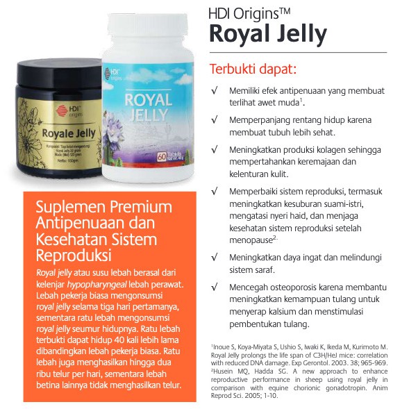 Royal jelly dijual dalam bentuk tablet yaitu isi 60 tablet/150mg dan liquid dengan ukuran 150 gram.