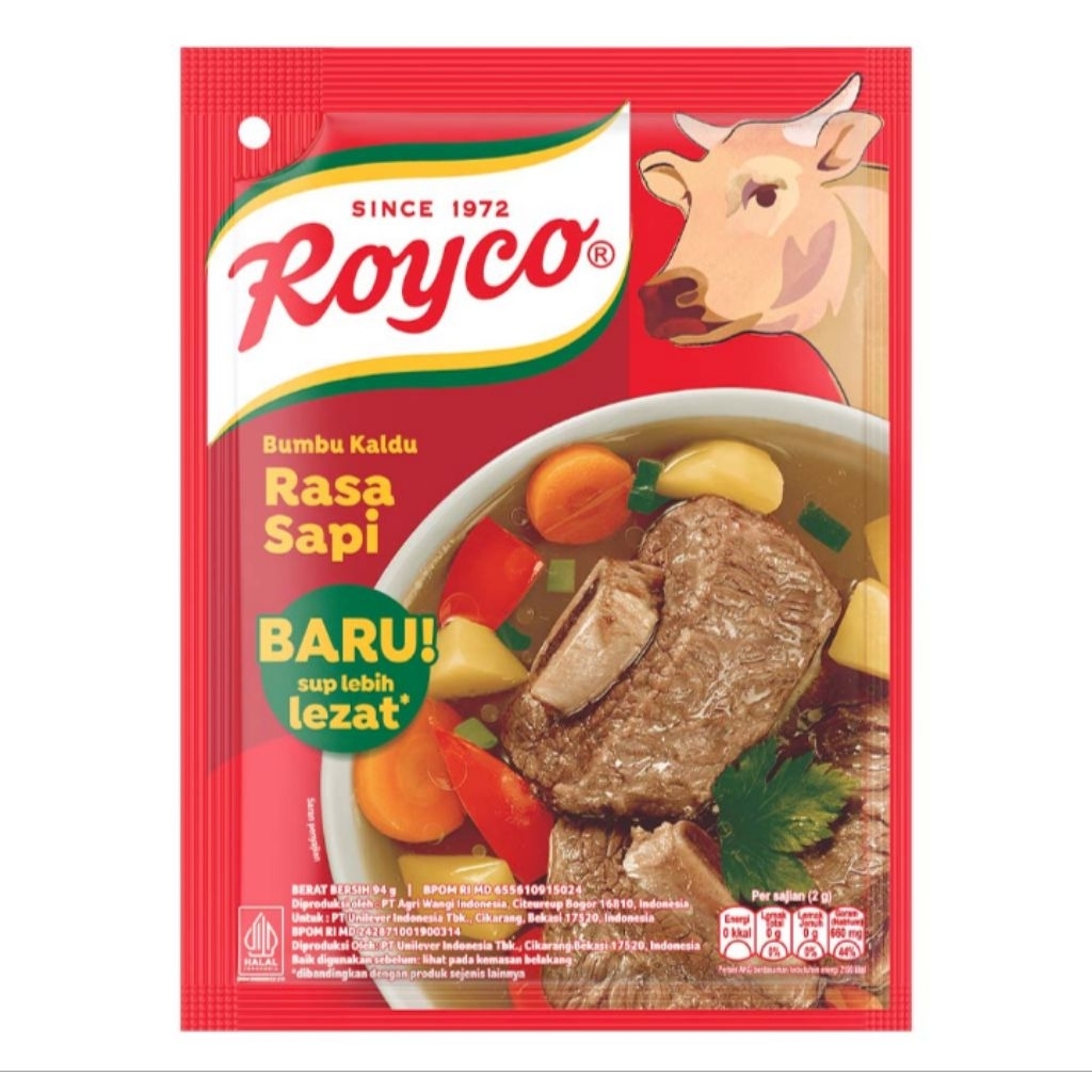 Royco Bumbu Kaldu Penyedap Rasa Sapi 94 g adalah salah satu inovasi bumbu masakan Indonesia berbekal pengalaman panjang selama 30 tahun yang diracik dari bahan-bahan dan rempah pilihan, seperti daging sapi pilihan yang direbus secara baik. Mudah larut dan meresap sehingga membantu memberi rasa kaldu yang mantap pada masakan Anda serta membantu memasak dengan mudah dan menyenangkan.