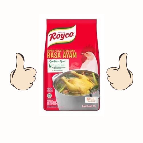 Kaldu masak Royco rasa ayam dengan kemasan 1kg. Produk Halal dan aman.