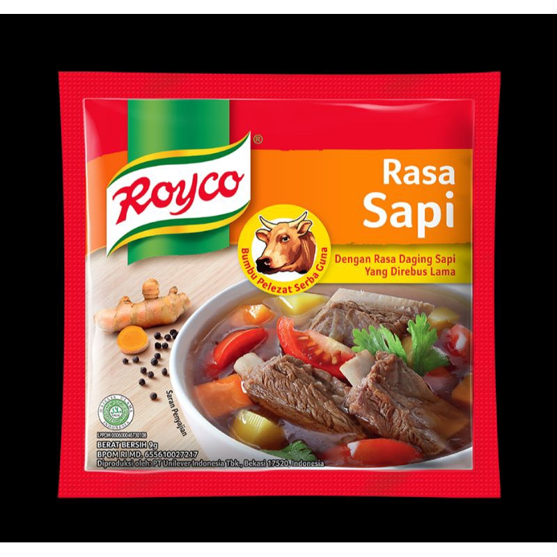 Royco Sapi merupakan bumbu pelezat serbaguna yang dibuat dengan ekstrak kaldu sapi. Terbuat dari daging sapi pilihan yang dicampur dengan beberapa tambahan bahan, seperti air, garam, telur, ikan, bawang, kedelai, dan kunyit.