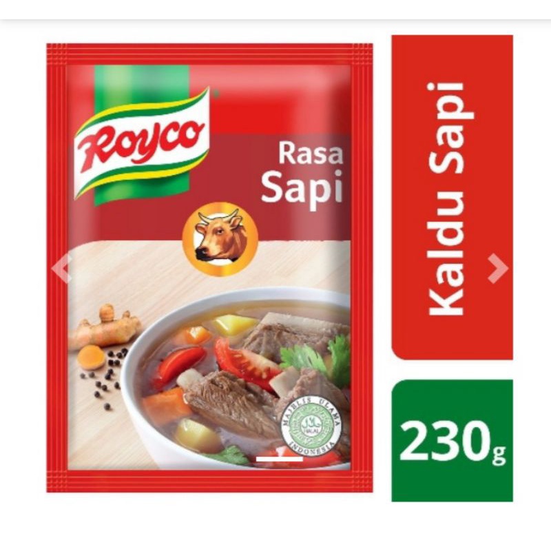 Royco Bumbu Kaldu Sapi 230g\nMerupakan bumbu pelezat masakan yang terbuat dari bahan-bahan dan rempah pilihan, termasuk daging sapi pilihan yang direbus lama. Memberikan rasa kaldu yang mantap pada masakan Anda.