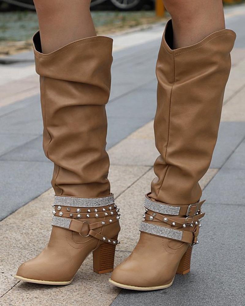Ruched Rhinestone Decor Studded Buckled Boots, Coffee