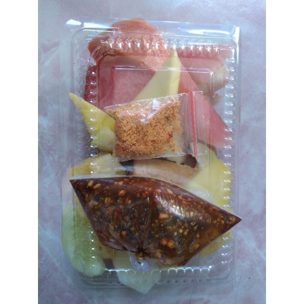 - Isi irisan buah Nanas, Jambu air, Kedondong, Timun, Tahu, Semangka, Pepaya, Mangga muda, Bengkoang