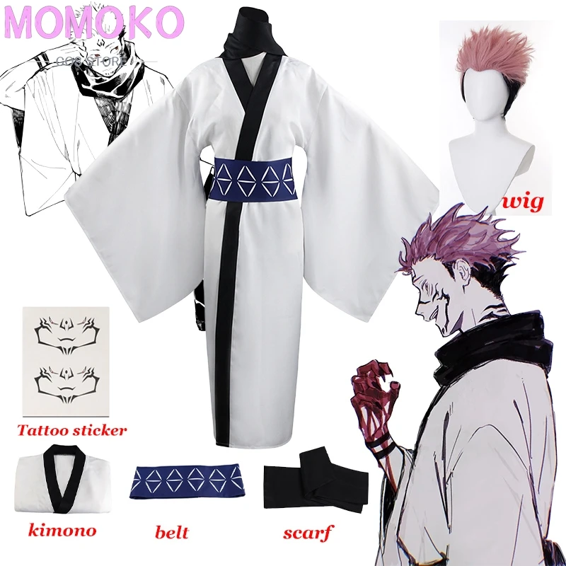 Ryomen Sukuna Косплей Coatume juютсу Kaisen Ryomen Sukuna Косплей Униформа с париком татуировки наклейки на Хэллоуин вечерние для женщин и мужчин