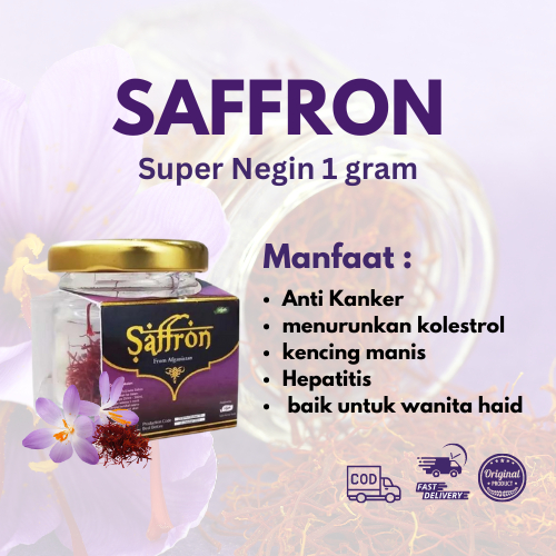 100% Pure Iranian Saffron kualitas terbaik (Super Negin Grade 1). Helai putik lebih panjang & lebar. Hanya diambil bagian putik yang berwarna merah saja tanpa bagian warna kuning.Hati-hatilah dengan Saffron palsu, Saffron original warnanya tidak seketika langsung luntur ketika diseduh dengan air. Meskipun Saffron berwarna merah, tapi air seduhannya berwarna kuning.